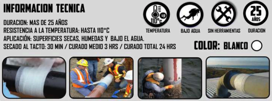 Kit de reparación para tubería hidráulico que esta compuesto por una cinta con compuestos químicos con tecnología híbrida Rhino y guantes que en conjunto reparan, sellan y recubren cualquier tipo de tubería de cualquier material de una manera practica, sencilla y profesional.