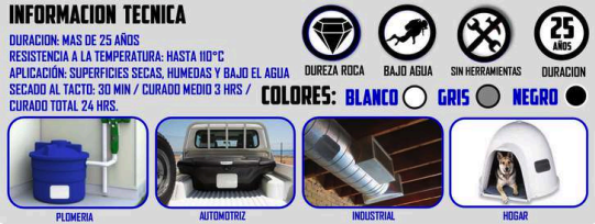 NO REQUIERE HERRAMIENTAS – para superficies planas y curvas, fácil de usar y la opción ideal para reparara prácticamente cualquier cosa, sella bajo el agua y con superficies húmedas o mojadas.