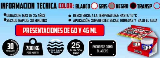 PEGA-RHINO Es un super Adhesivo bicomponente híbrido de ultima generación y de alta calidad, desarrollado para resistir las mas exigentes condiciones físicas y químicas con una alta duración de mas de 25 años en condiciones optimas. Ideal para reparaciones en el hogar, industriales, navales, eléctricas y construcción. Puede ser usado en cualquier superficie de cualquier material, superficies secas, humedas y bajo el agua.